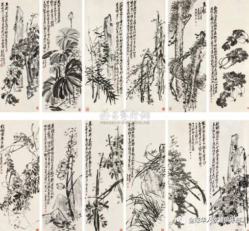 1917年作 花卉屏风十二扇 屏风 水墨纸本