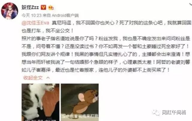 昨日妖怪再次发猛文:“@沈佳玉Eva 真尼玛逗,我不回国你也关心?死了对我的这条心吧,我就算回国也是打车,我不坐公交!照片的事老子指名道姓说是你了吗?粉丝发我,我也是不确定发出来问问粉丝是不是,问号看不懂?还是没读过书?你不如再发一个誓和土豪睡过死全家好了!我跟你们网友讲个规律!我黑的事情但凡实锤扎心了的,主播都会出来澄清!想想当年雨轩被我说了一句结婚那个急眼的样子,心理素质太差!阿哲的老婆刘馨如儿子崔嘉译,最近也是忙着搬家,连他儿子的外婆都不上街买菜了!”