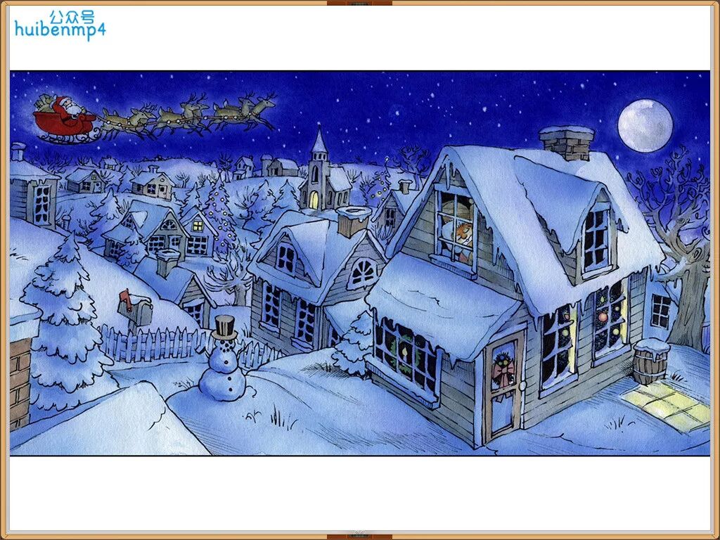 圣诞夜,白雪覆盖了整个世界,门口还有雪人儿,哈哈,看到圣诞老人了吗?