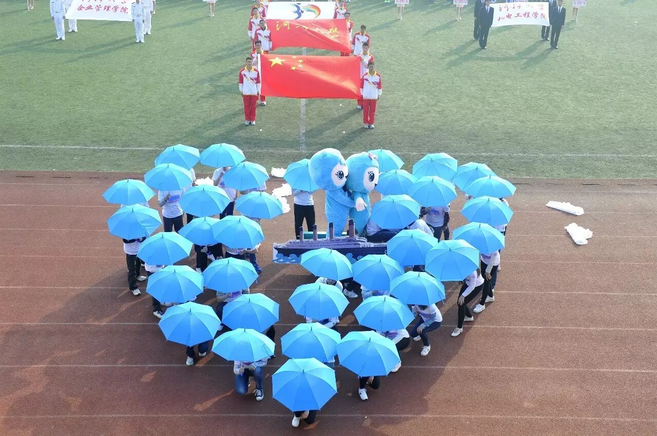 物联网院14级代表队入场。蓝色的雨伞此起彼伏,两个吉祥物开着“河海号”摆出了泰坦尼克号的经典动作。河海汤汤,水之子们犹如在大海中航行,不惧艰险,终能以破浪之勇抵达梦想的彼岸。