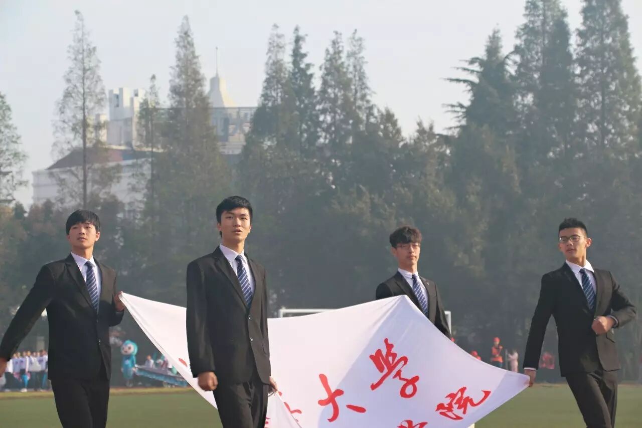 企管院16级代表队入场。“河出伏流,海纳百川,商舟之子,勇往直前”的标语,体现了“河之渊源,海之广博”的河海精神。