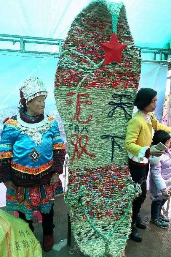 标准的文字说明是:2017年3月5日,广西灌阳县“千家洞瑶族文化旅游节暨二月八传统农具节上,当地60岁的民间艺人袁士诚(左)向游客展示了一只高2.3米、宽0.9米,重量达16公斤的巨型草鞋。