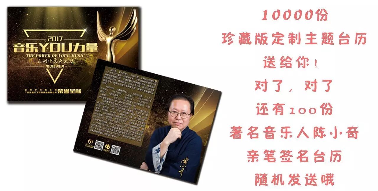 专注亚洲中文音乐大奖(亚洲中文音乐榜)官方微信公众号,在微信对话框发送你的邮寄地址给小编,就有机会获得有亚洲中文音乐榜、广东融通天下控股集团有限公司联合送给你的开年大礼珍藏版陈小奇音乐作品书法主题定制台历一份哦,赶紧呼朋引伴来抢台历吧,么么哒。
