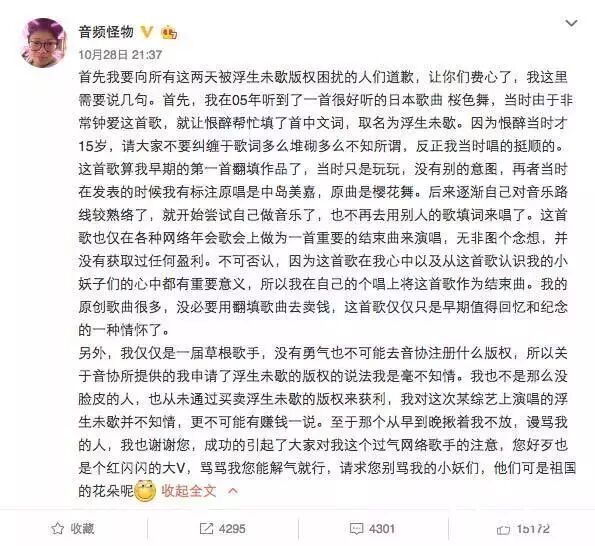 需要注意的是,音频怪物进行的并非是公益性质的演出,而是有盈利需求的商业演出。因此根据国内法律法规对于侵权的认定,加上音频怪物自己也称没有从原著作者获得授权,在没有取得原作授权的情况下现场演绎该作品,并取得收益,本质上已经构成了侵权。