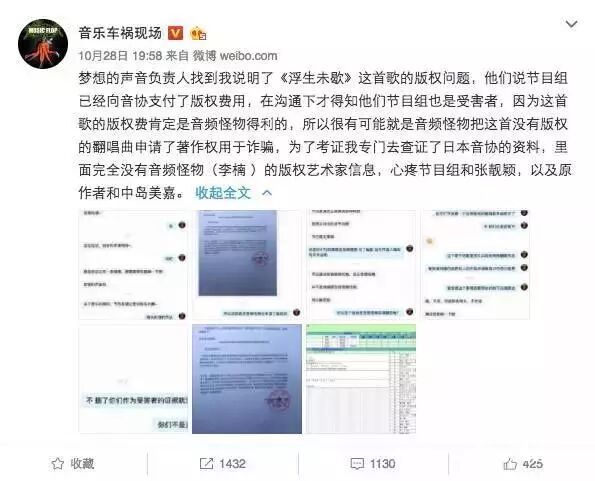 随后的第二天,音乐车祸现场在经过与节目组工作人员的初步沟通后,再次发微博表示,音频怪物此次有极大可能收受了该歌曲的版权费,其行为本质上是在利用已构成侵权的歌曲实行“诈骗”。