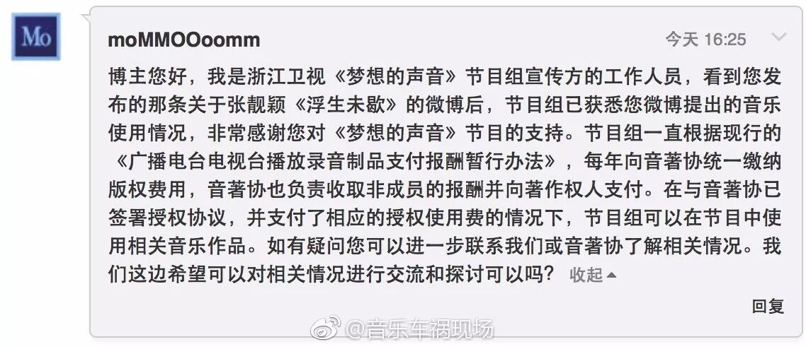 同样是利益相关方之一的《梦想的声音》节目组也在28日晚向音乐车祸现场私信,相对正式地回应表示,