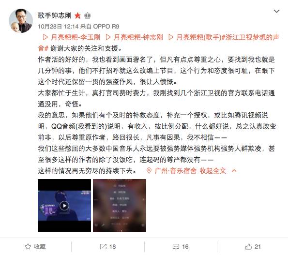 无独有偶,同样是发生在《梦想的声音》第二季刚刚播出之际,微博ID为@歌手钟志刚的用户也于28日发微博称李玉刚在节目中演唱的《月亮粑粑》构成了侵权,而他正是这首歌的原作者,且至节目播出都没有得到节目组的任何通知或收到任何版权费用。