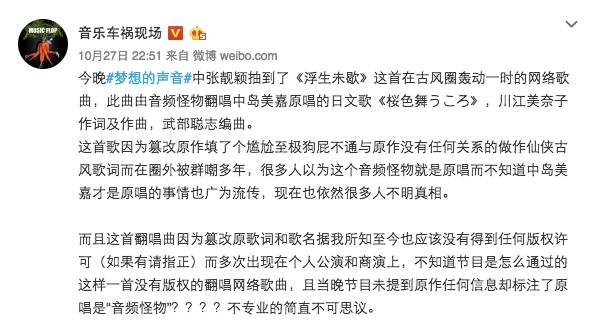 当晚,首次加盟并担任导师的张靓颖演唱了一首在古风圈颇具知名度的歌曲《浮生半歇》。这首歌的曲部分来自日本流行女歌手中岛美嘉的作品《桜色舞うころ》(中译《樱花纷飞时》,川江美奈子作词及作曲),词部分则由古风圈的人气歌手音频怪物(本名李楠)重新填写。然而,出于节目组在播出字幕中将原唱署名为音频怪物,且并未列出作曲者等等的原作信息等原因,随后,微博音乐博主@音乐车祸现场表达了他的质疑: