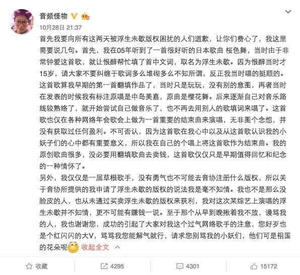 28日晚9点,音频怪物在微博中回应称: