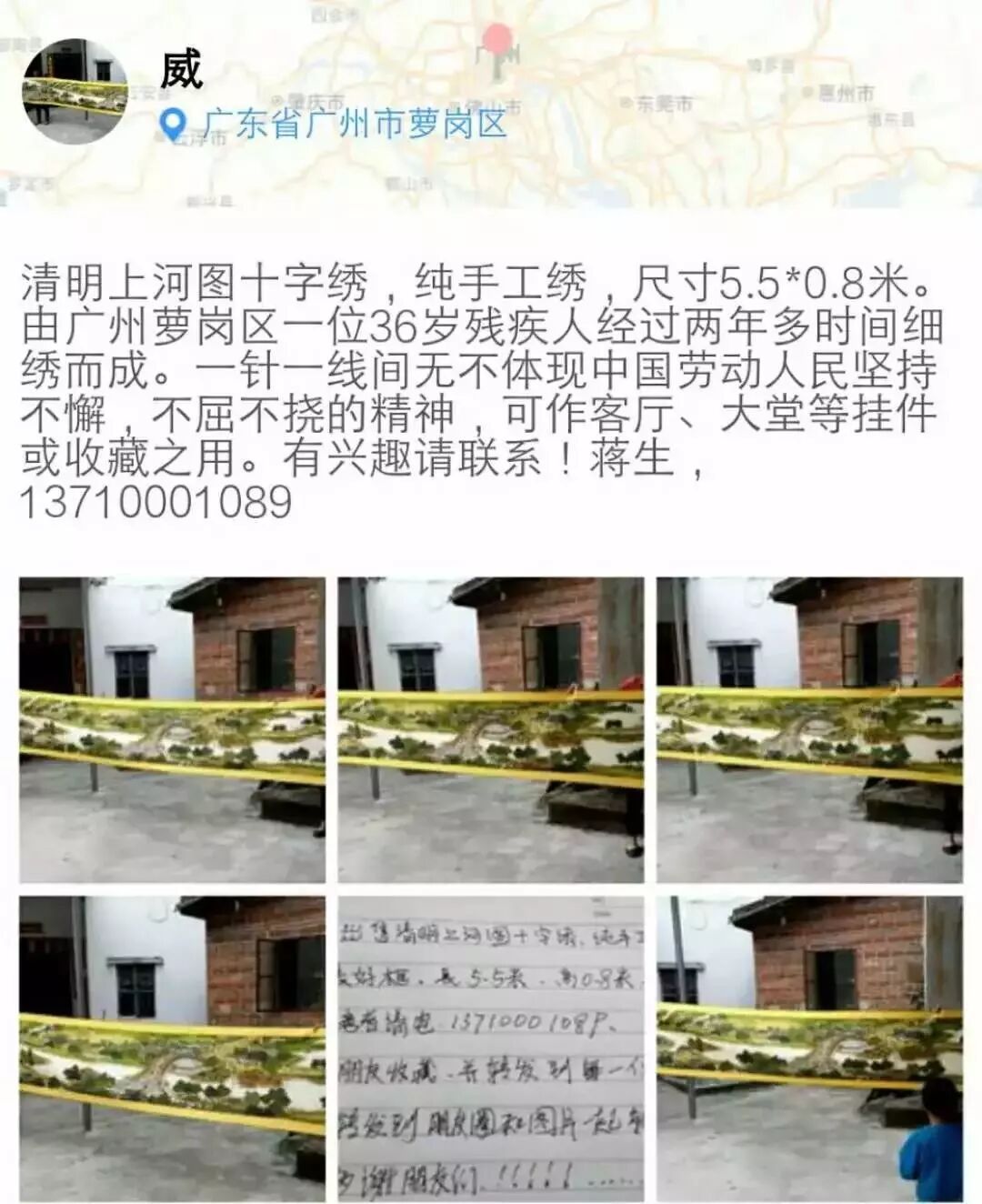 求助内容:本人自小是残疾人。自幼无父无母,老婆也是聋哑人,现在生活艰苦困难,耗时2年半绣了一幅清明上河图,是纯手工绣花,长5.5米,高0.75来,一针一线间无不体现中国劳动人民坚持不懈,不屈不挠的精神,可作客厅,大堂等挂件或收藏之用。