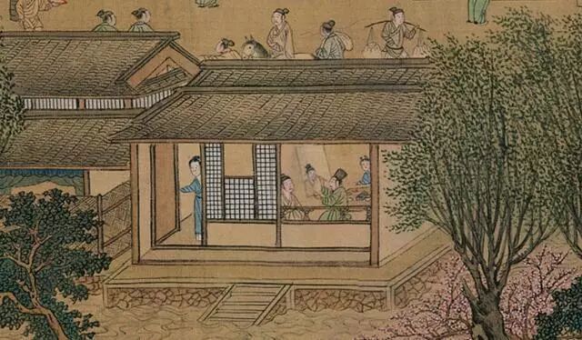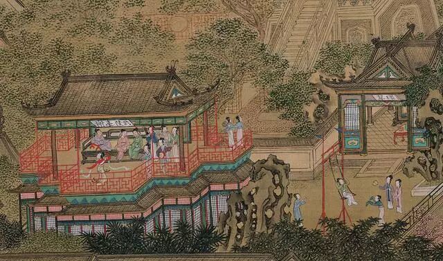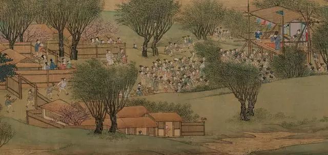 仇英版《清明上河图》的开卷有一个乡间大戏台,戏已经开锣,台下坐满了观众。你注意看台下坐著的观众,都是男的是不是。女性观众到哪里去呢?在围墙里看戏。明朝时,人们特别讲究男女大防,便发明了女性看棚这玩意儿。那围墙里面,就是女性专用看棚。