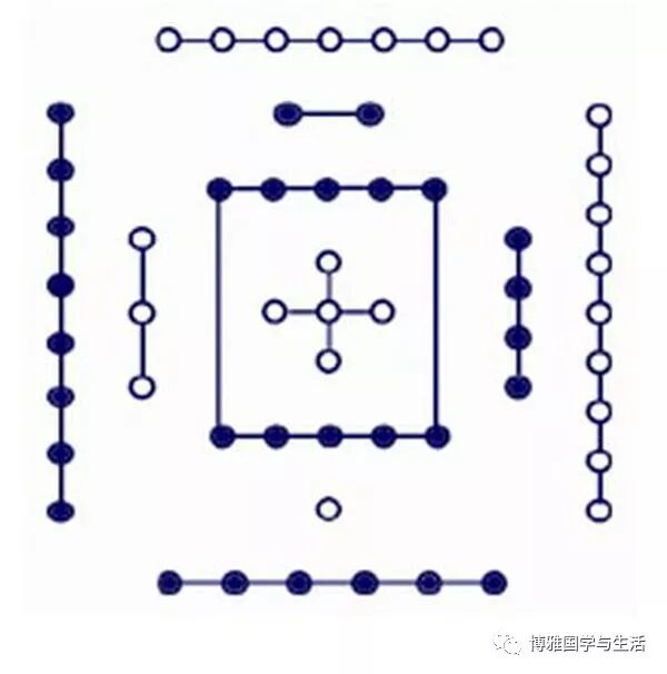 其中5与10居中,1、2、3、4分别与6、7、8、9相配居于北、南、东、西四方,若用其中北方之数7(1与6相加),除以东方之数11(3与8相加)所得正好也为:7÷11,280与440分别是7和1l的40倍,而40之数也正好是《河图》北、南、东、西四方之数的总和(1+6+2+7+3+8+4+9=40). 不仅数值比和倍数关系相对应,方位关系也完全一致。