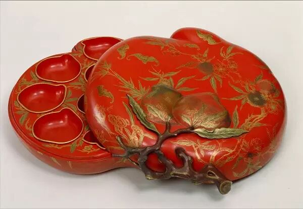 红漆描金福寿纹桃式攒盒