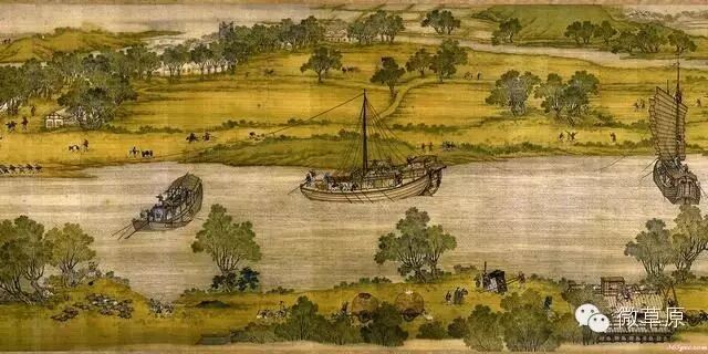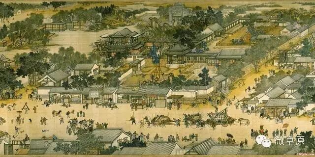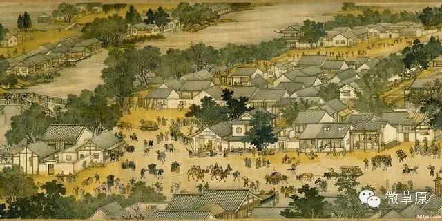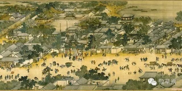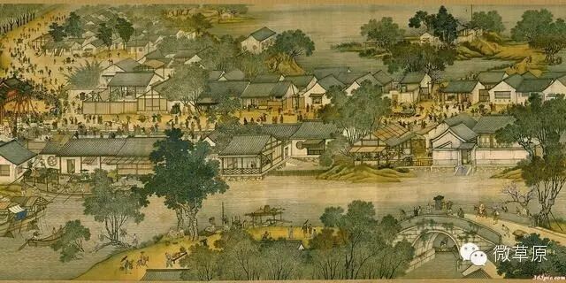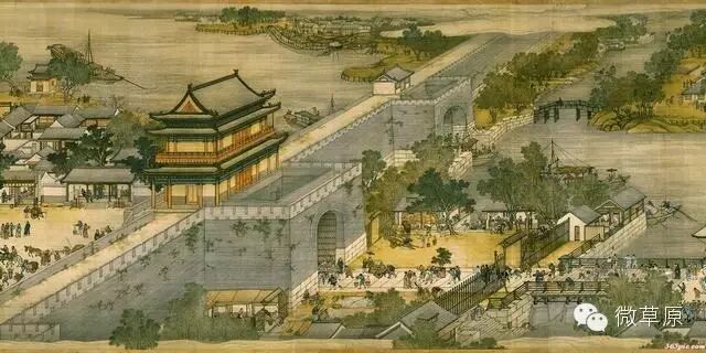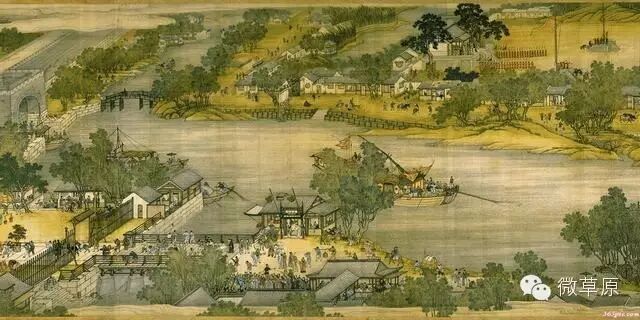 《清明上河图》是宋代画家张择端的作品.这是一幅表现北宋都城汴梁(进河南开封)和汴河两岸清明时节风俗世情的长卷.画面的内容可分为三个部分.第一部分描绘市郊的景象.初春的清晨薄雾尚未散尽,一片枝芽萌动的小树林,数间农舍掩映其中,农田出绿,阡陌纵横,赶集的人们和驮运货物的骡马从条条道路向城里进发.在汴河码头停泊着数条大船,其中有一条装满了粮食,一些人正在忙着搬运. 顺着波光粼粼的汴河展卷看去,画面进入第二部分.屋宇错落,古柳参差,临河的茶肆之中,摆着桌凳.河中船只往来不断.一座精致的拱桥,宛若飞虹,沟通两岸.行人众多,车水马龙,人声鼎沸,热闹非凡.一艘木船正要穿过拱桥,桅杆已经放倒,船工握篙盘索.桥上桥下,许多行人驻足观看.从人们张嘴挥臂的动作中,似乎听到了船工们吆喝的号子声和众人的喝彩...
