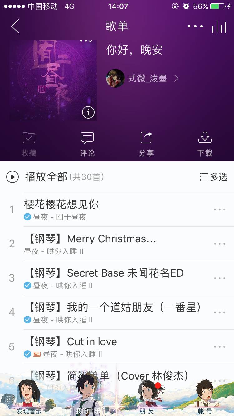 昼夜每晚会有哄你入睡系列的钢琴曲放进去,每天听都不会重样。不管是什么类型的歌,都用钢琴为你弹奏。“这个歌单的名字取得真好。愿我的琴声哄你入睡,愿你今夜好梦,愿你夜夜安眠。”