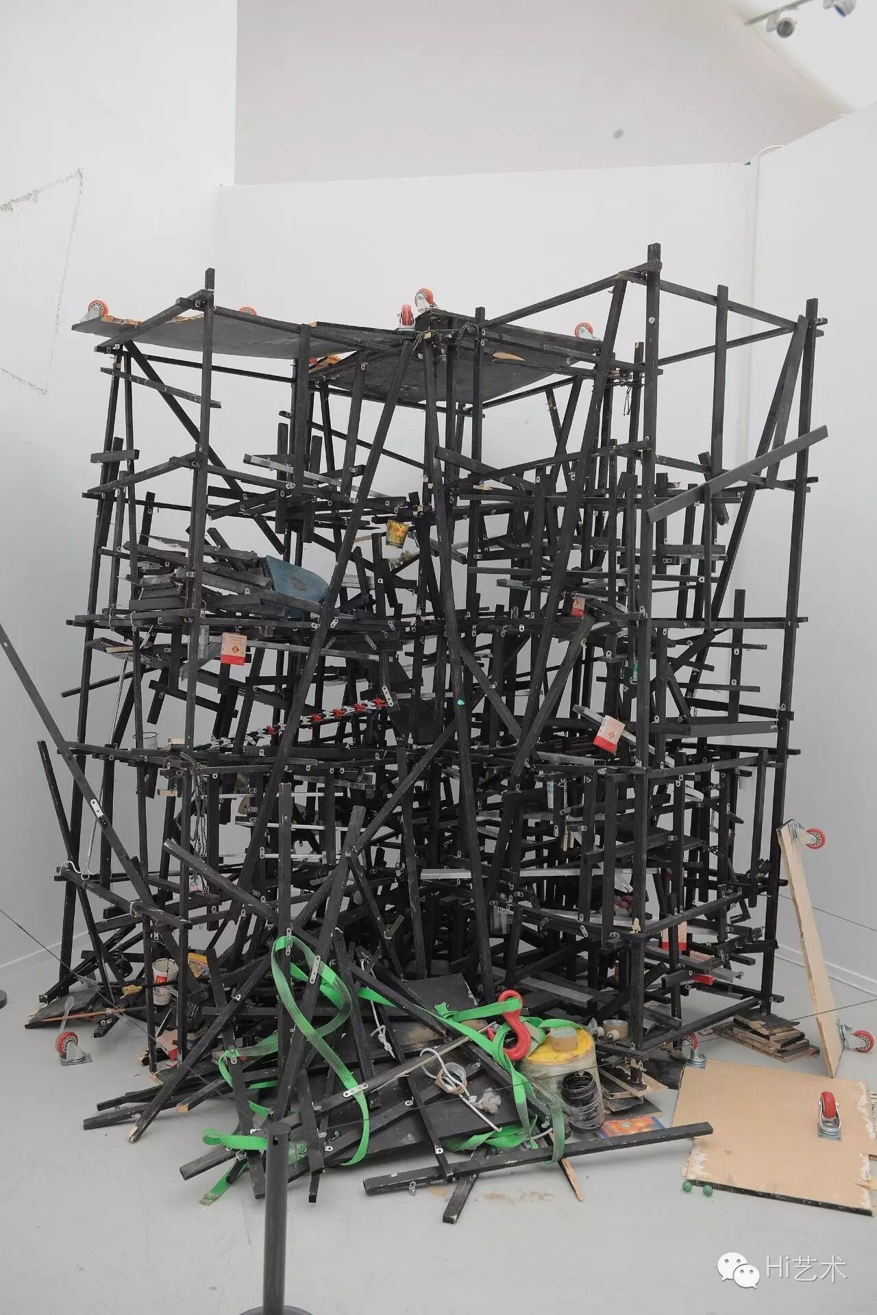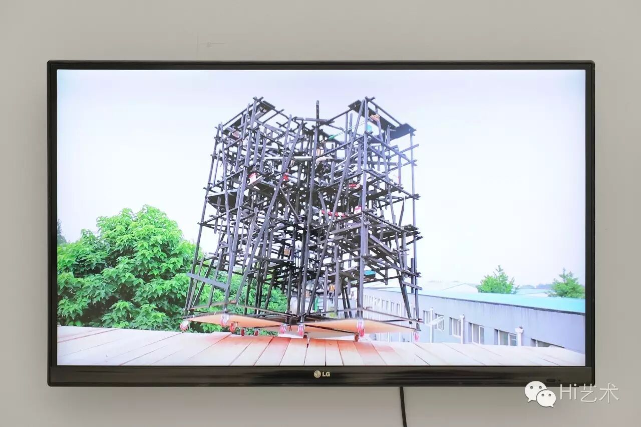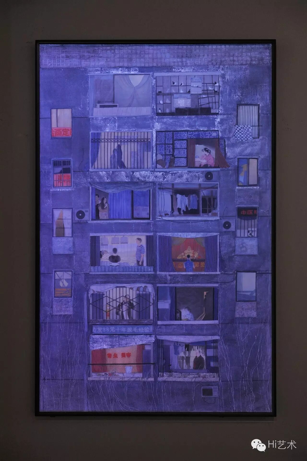 “作品共有56个小单元构成,其中32个小单元被嵌入绘画作品。城市空间本身就是一个在物质世界中制造的人类幻想,复杂的关系正在将原物与仿像都凝固在当代生活之中,它们被这个巨大的摩天大楼所吞噬,大楼是抓取故事的舞台。”