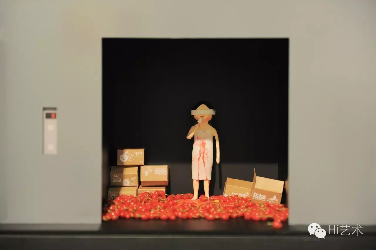 “偷食禁果被认为是人类的原罪及一切其他罪恶的开端。此作品将人与玩偶的元素相结合,带来对人性的深入思考:食禁果,究竟是使“人”变成了麻木又被社会摆弄操纵的“玩偶”,还是使“玩偶”变成了拥有喜怒哀乐又会产生罪恶灵魂的“人”?本作品通过两个人物的表情和道具传达出自上帝创造人类并将其赶出伊甸园之后,人类懊悔并极力要改变自己命运和挣脱死亡束缚的永恒童心。这是我自我心灵的写照,也是我对自己未来命运的预设。”