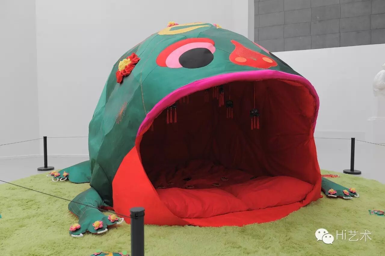 “民间艺术中,经常用精巧的蟾蜍图示表达多子与辟邪。我用民俗布艺刺绣的技法制作一个在外观上放大数倍的蛤蟆耳枕,成为一个蛤蟆房屋。屋里是一个温暖、舒适的床榻,创造出一个神圣而有趣的‘婚房’。”