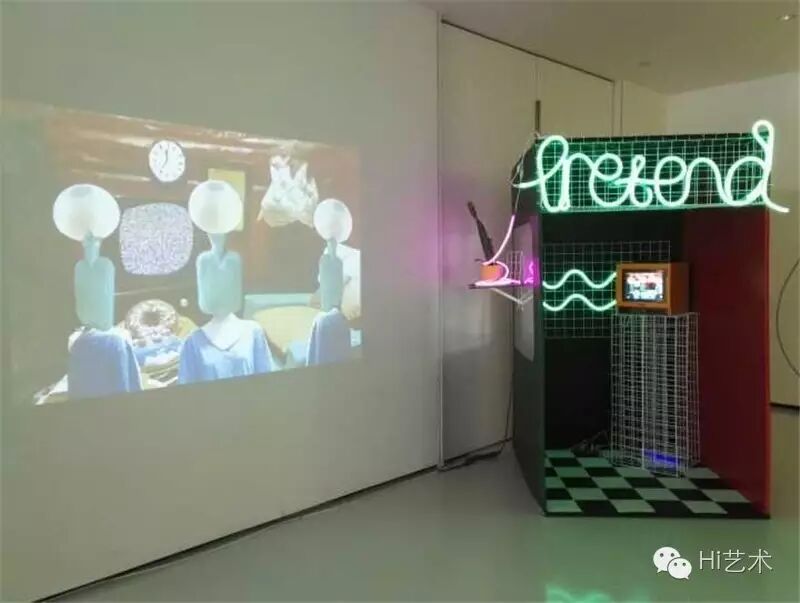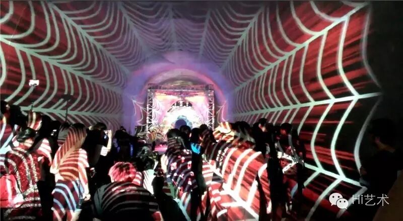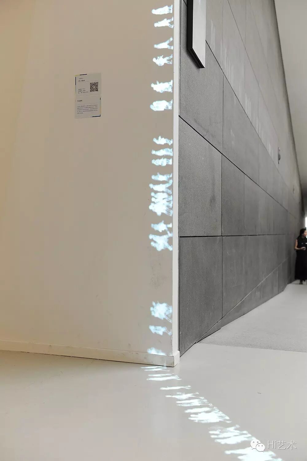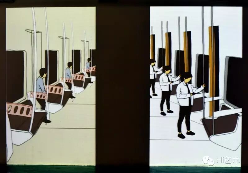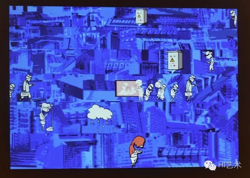 “行走是人移动的方式,影像中富有生动个性特征和超现实意味的小人行走在现实建筑空间中,一条绵延的人流不再是抽象的行走,而是去适应和突破建筑空间的各种结构,和现实建筑发生关系,给人以一种现实中的感觉投射和对生活中人和空间关系的隐喻。作者尝试打破投影空间,使其在建筑中形成纵深的空间,让观众在移动中能多次感受影像,类似一种伴随关系。”