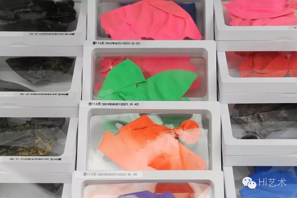 “每天爆一个气球和14个小时爆216个气球,同样的行为,结果却不同。人的寿命有十几年,而蜉蝣的寿命却只有一天,不同的生命在体验着不一样的时间维度。432个气球皮以隐性的方式记录时间,而影像以显性的方式记录时间。”
