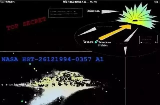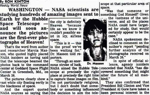 1994年2月8日,美国世界新闻周刊(Weekly World News)刊登了一张照片,这张由哈勃太空望远镜摄于1993年12月26日的照片清楚的显示出,在茫茫的夜空当中有一大片璀璨无比的城市,这就是人们努力寻找的“天国世界”。据说,这张照片只是传回的照片中的几百分之一。