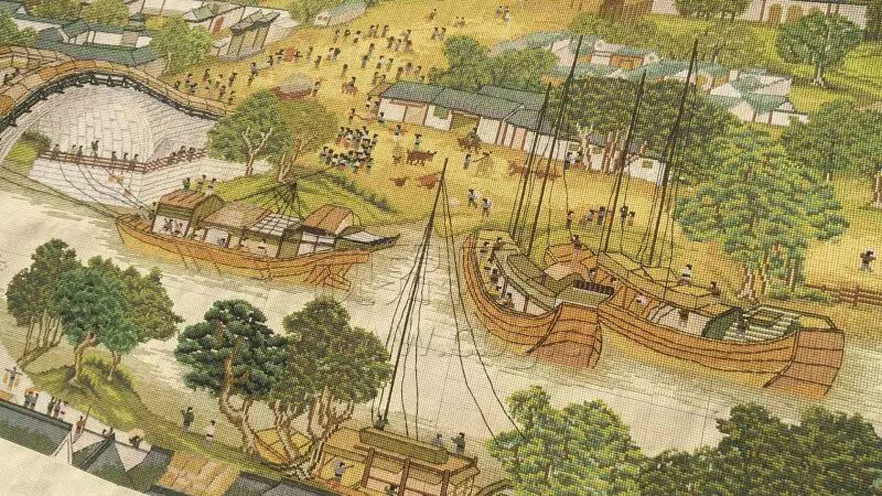 从2011年开始,她开始绣《清明上河图》,期间最困难的是区分里面景物的颜色,比如说画面上的树木同样是绿色,还有深绿和浅绿之分,有时候,几处针法不对就要返工,确实不容易。她说,光购买需要的材料套件就花了6000多元,其中彩线就用了49种,很长一段时间几乎就是一坐下来就是一整天,腰酸背疼、眼睛发胀是常事,但所有的困难都抵不上完成作品的喜悦。