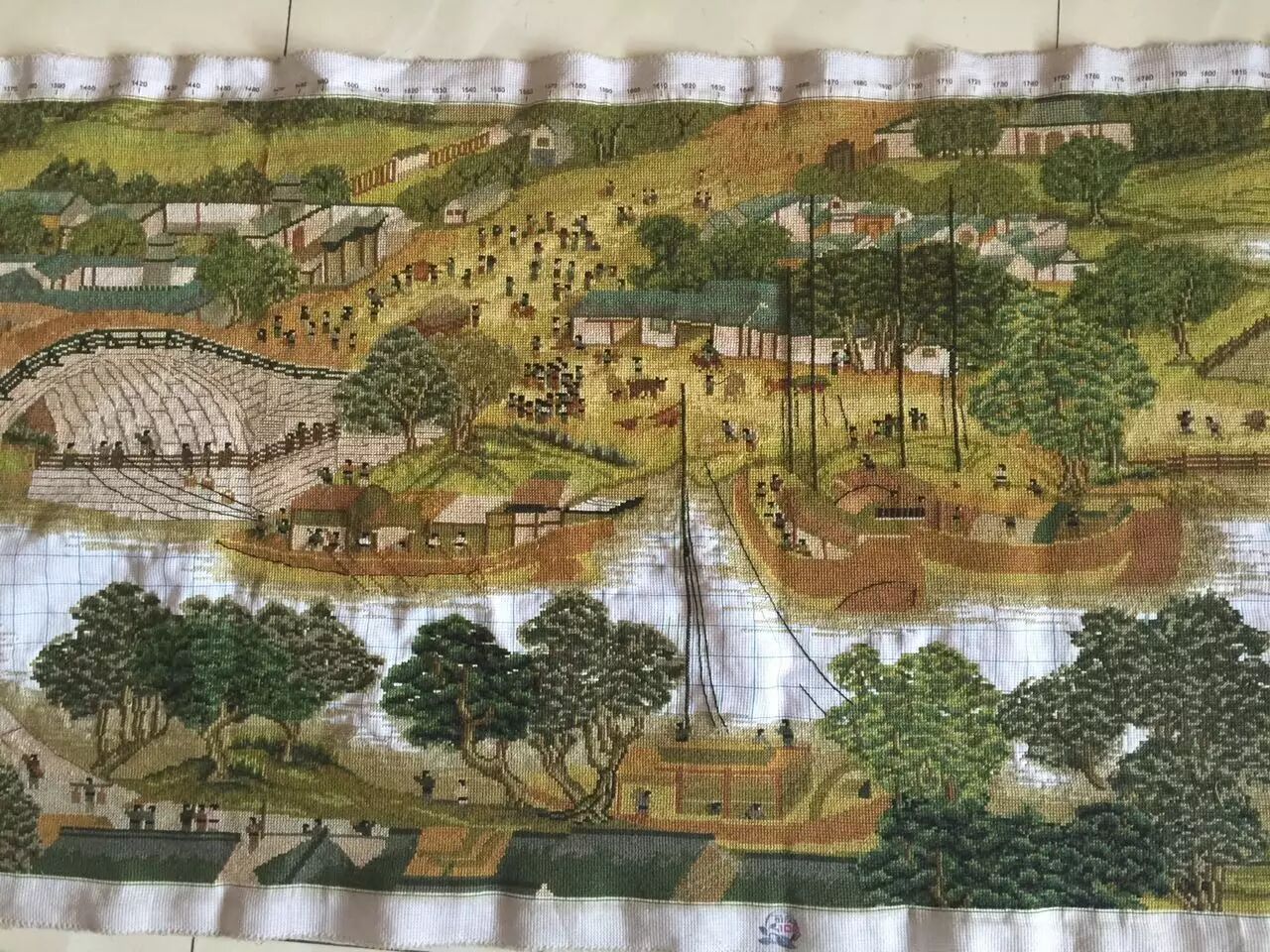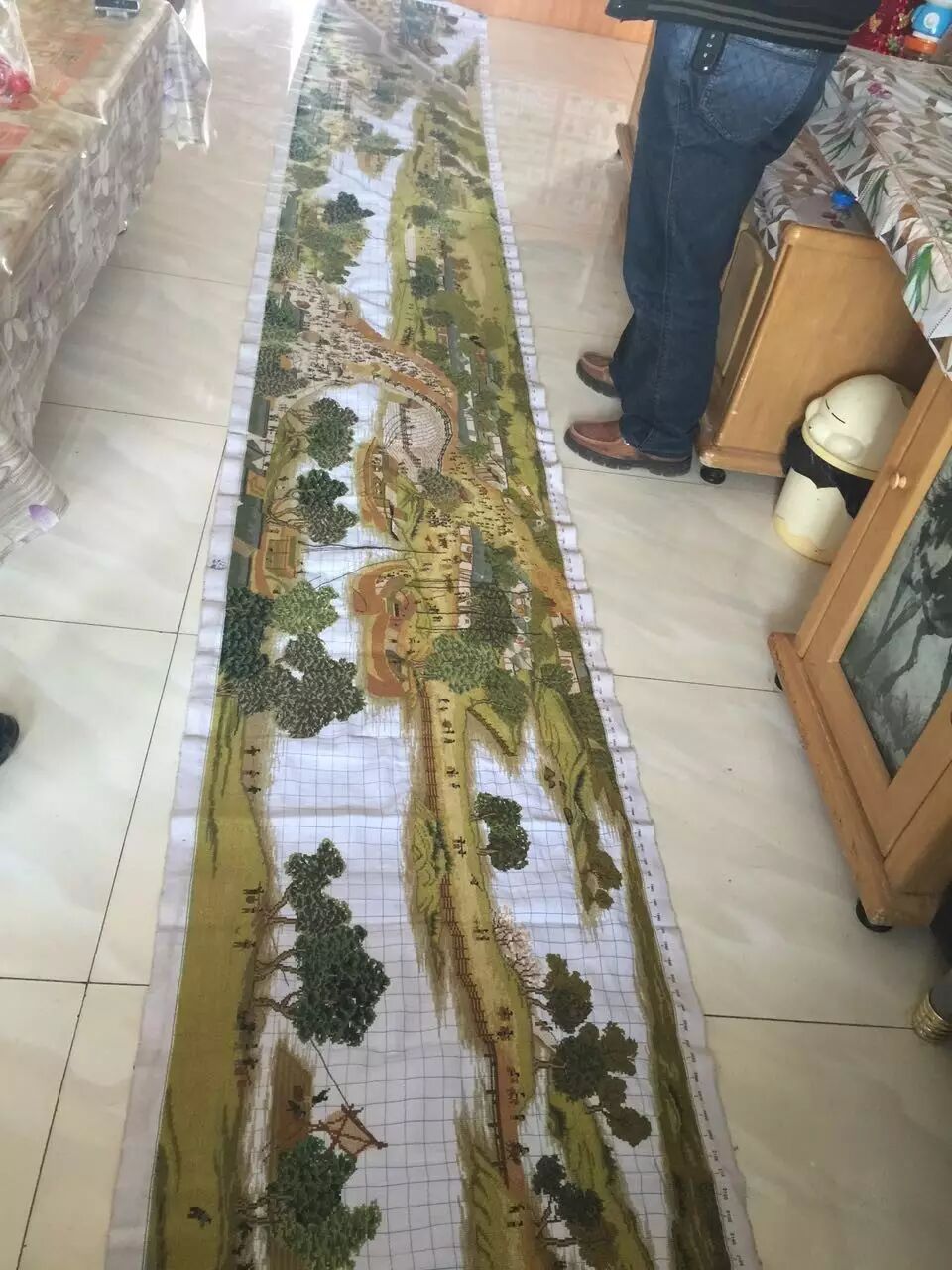 二十年前,搬到县城居住,忙惯了的南世英坐不住了,开始学着绣十字绣。从绣花鞋、鞋垫到大幅绣品,一发不可收。近年来,仅两米以上的绣品就有十几件,牡丹、八骏图、诗词、中堂……每一幅老人都力求精益求精。去年4月,南世英突发奇想,要绣个6米长的“清明上河图”,问了好几家卖十字绣的商店,都没有这么长的。老人便打电话到兰州厂家定做,1个月后才收到。南世英的儿媳告诉笔者,“清明上河图”老人已经绣了11个月,每天要绣10个小时以上,常常忘记吃饭。