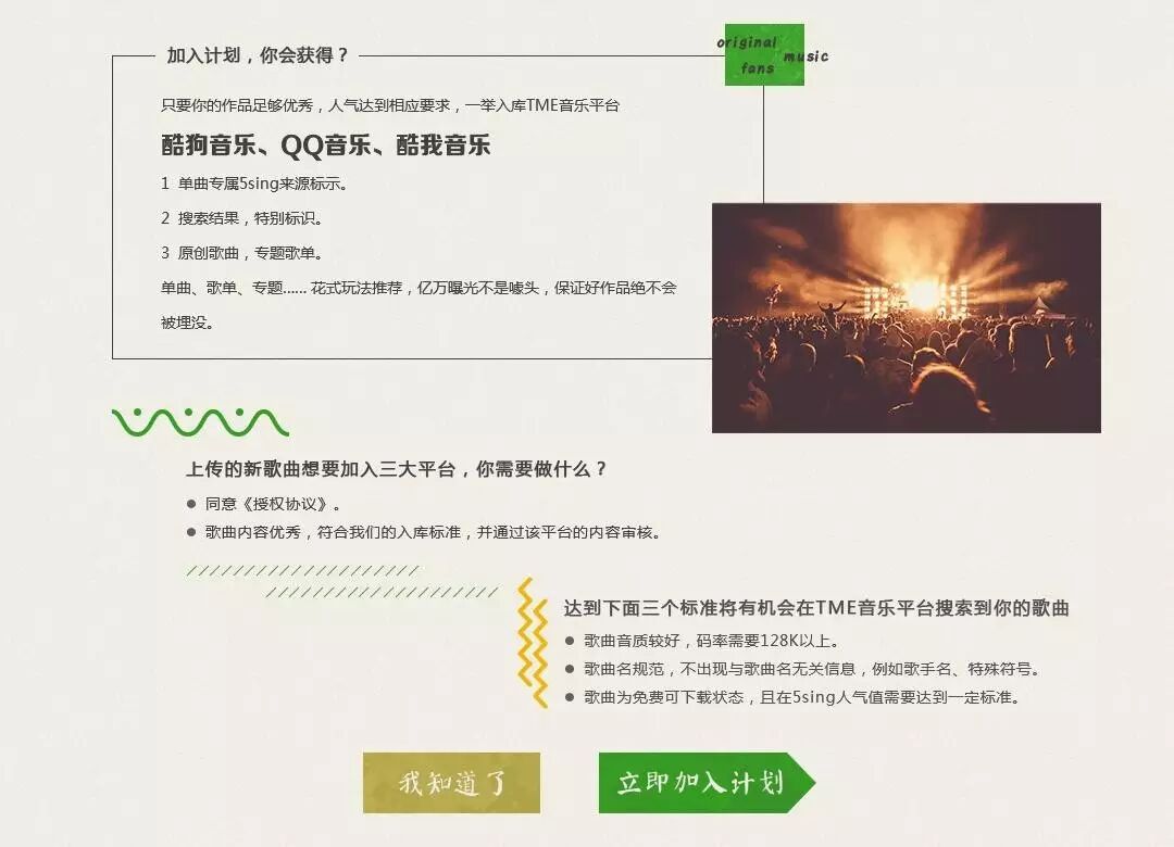 为答谢广大音乐人对5sing平台多年来的支持,也为了让更多优秀有才华的音乐人加入到5sing大家庭中,为了让优秀的你可以去向一个更大的舞台,5sing联合三大音乐平台(酷狗音乐、QQ音乐、酷我音乐)开启“5sing音乐亿万粉丝计划”,音乐人只要入驻5sing平台并上传音乐作品,就可以自主选择是否上架给三大音乐平台,只要你的作品足够优秀,就能一举获得市场三家主流音乐平台的优质渠道推广流量,并获得:单曲专属5sing来源标识、搜索结果特别标识,还有原创歌曲、专题歌单、单曲等花式玩法推荐,亿万曝光不是噱头,保证你的优秀作品不被埋没,实现精准、快速“圈粉”。
