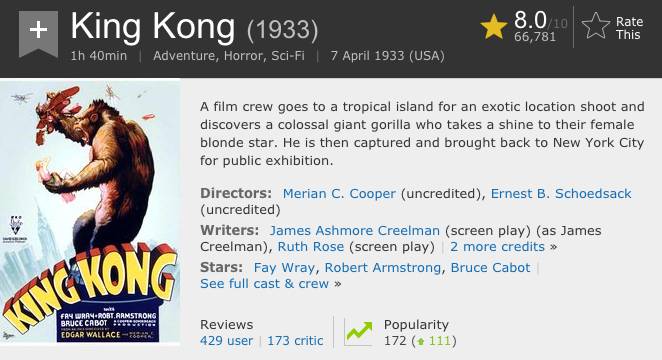 后来,在一次探险中,梅里安·库珀被一个狒狒家庭吸引,决定要搞一个剧本。于是在1933年,金刚诞生,梅里安脑海中金刚爬帝国大厦的场景也被还原在了电影中。