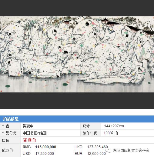2011年春拍,共拍出吴冠中作品19幅,成交18幅,总成交额高达2.26亿元,成交率高达95%。而在这一年,吴冠中字画价格突破千万大关的更多,像他的《长江山城》最终以1461万元的价格成交,他的作品《青岛》,以4025万元的价格成交。而他的作品《木槿》更是拍到了6325万元。