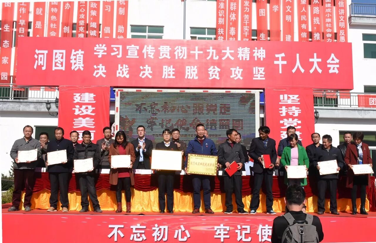 11月15日,河图镇召开“学习宣传党的十九大精神,决战决胜脱贫攻坚千人大会”。来自全镇21个党支部的600多名党员参加了大会。这是主席台领导为获得“四个一批”先进单位和先进个人颁奖授牌。
