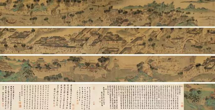 《清明上河图》为北宋宫廷画家翰林待诏张择端所作,绢本设色,纵24.8厘米,横528.7厘米,现藏于故宫博物院。