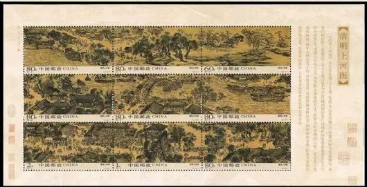 国家邮政局定于2004年10月18日发行《清明上河图》特种邮票1套9枚。《清明上河图》特种邮票依据原版《清明上河图》设计,全套九枚,横三连,版票采用套票连印的形式呈现。全套邮票分三个段落,一到三枚表现了汴京郊野的春光,四到六枚描绘了繁忙的汴河漕运,七到九枚是对市井街道的描绘,反映了宋代都城街道纵横、商贸繁华的景象。