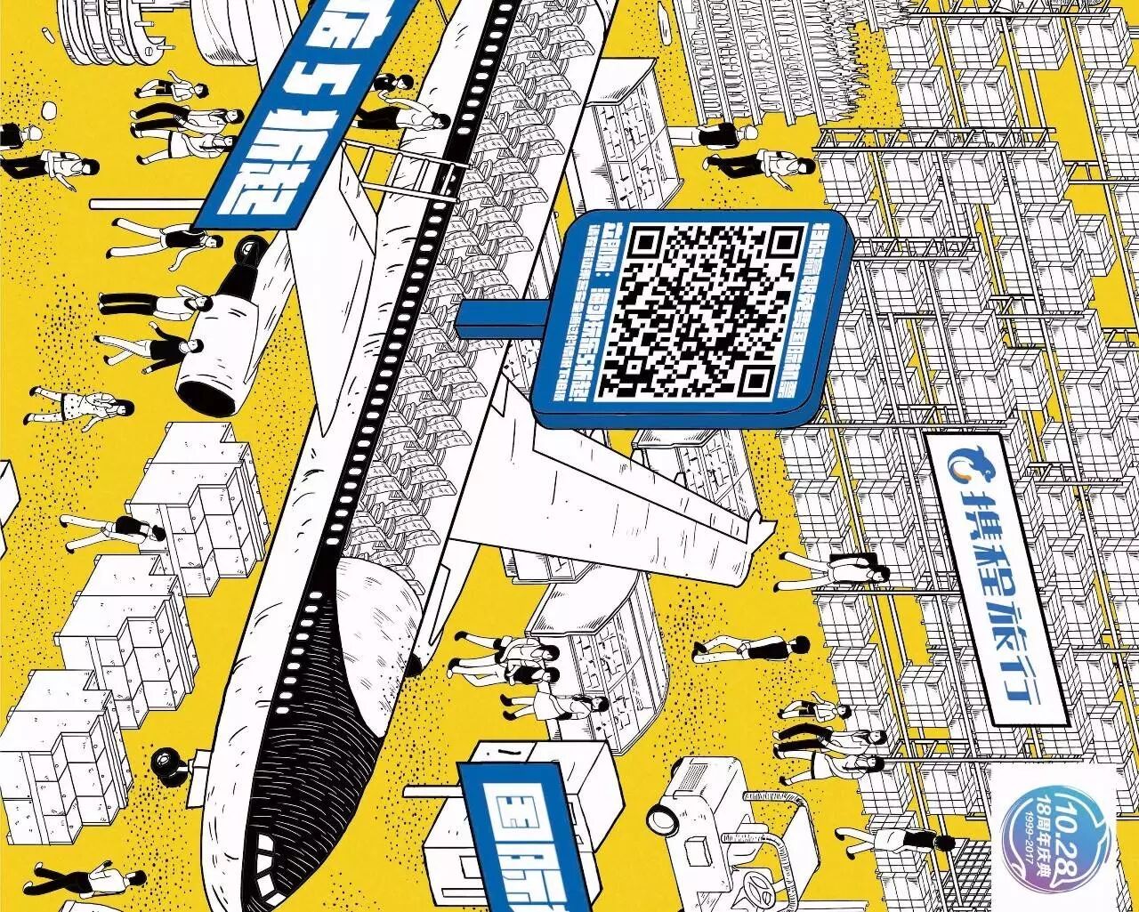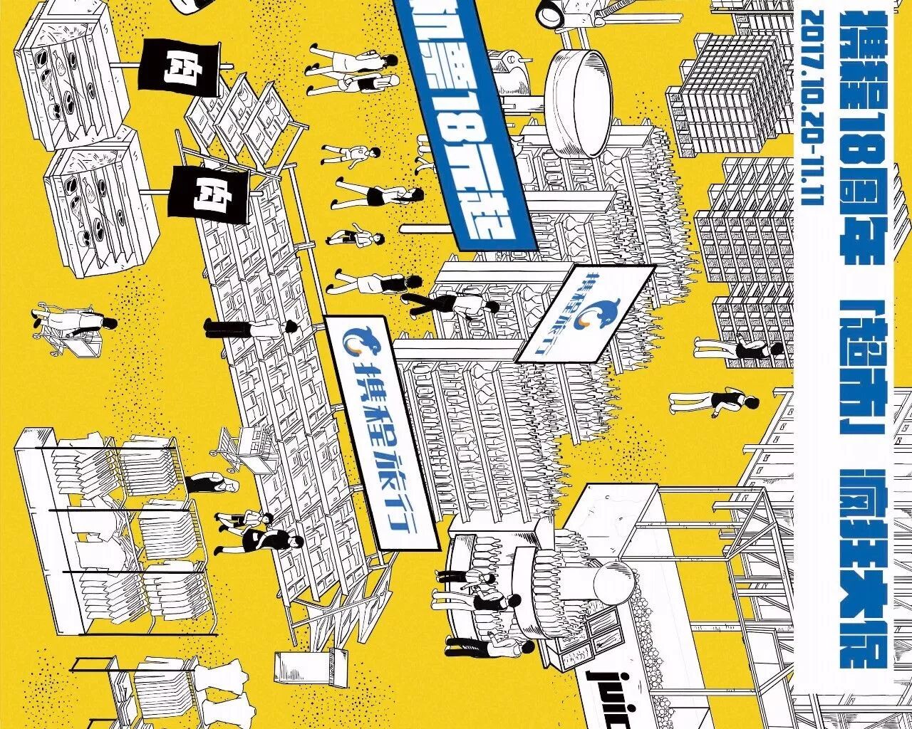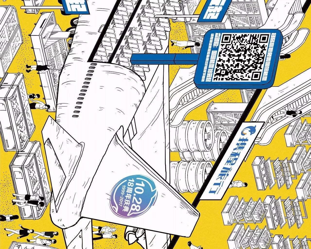 携程的18周年大促,突发奇想,把图上这个场景搬到了地铁里。不仅绘制了这样的一张长图,还在地铁开了个“特卖超市”。