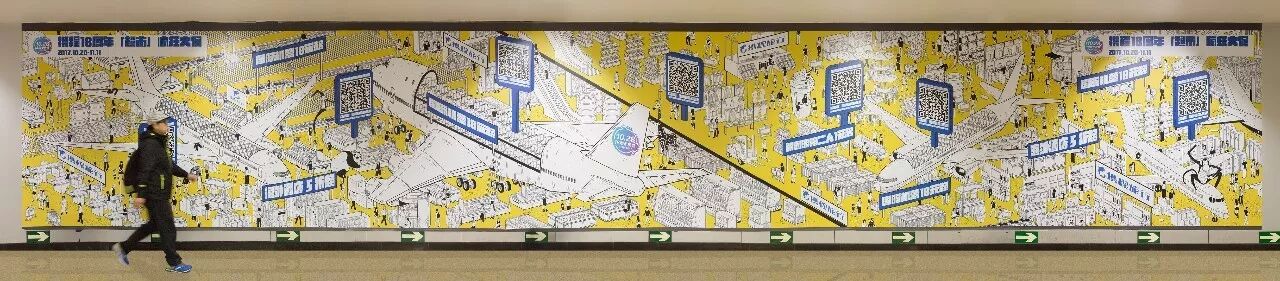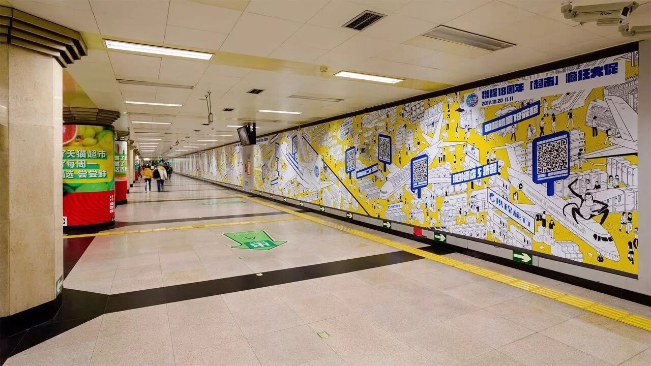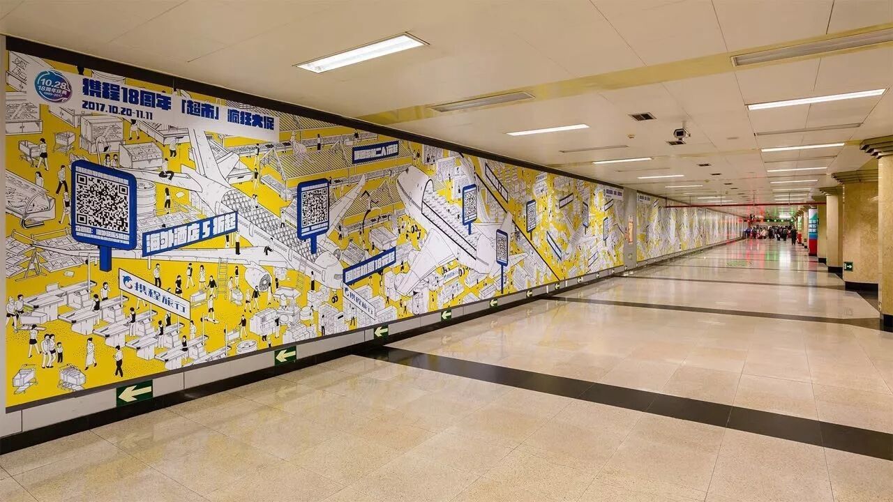 携程把绘制的这幅类似清明上河图的长图,、B、C出口附近的墙贴上。把途经的每一位乘客自然拉进“地铁超市”这个场景,营造出人在超市中游走的效果。
