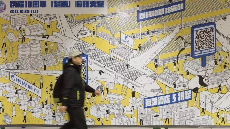 但不同的是,携程的这幅地铁长图里有各式互动的花样。比如抽奖活动,免费机票天天抽;比如折扣疯抢,国际机票18元起,海外酒店五折起,跟团游第二人1元起……全都放了巨大的二维码“幡旗”,一路走一路扫。