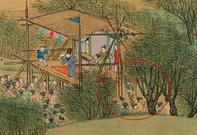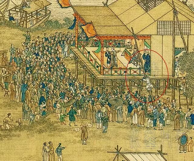 仇英本《清明上河图》的开卷,是一个乡村戏台。看戏的人中有两个熊孩子,爬上了高高的木杆看戏,也不怕扯坏了裆晚上回家挨娘骂。