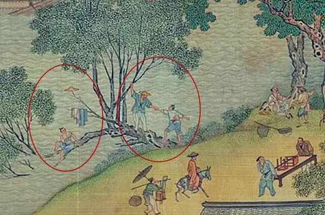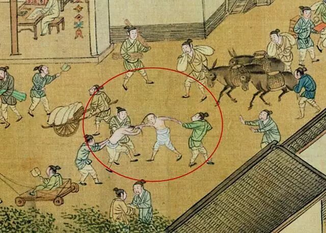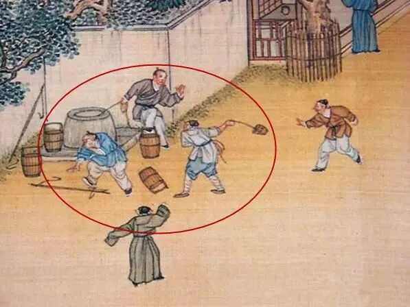 清院本的《清明上河图》也有人在打架:两个打水的伙计因为争前后而打了起来,这家伙太猛了,一个抄扁担,一个抡木桶,真是要玩命啊!