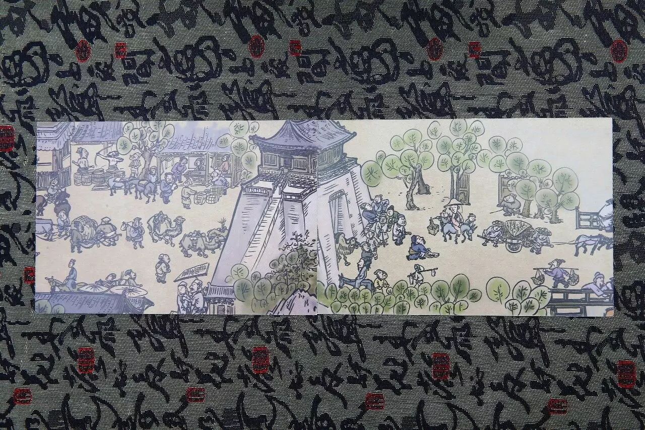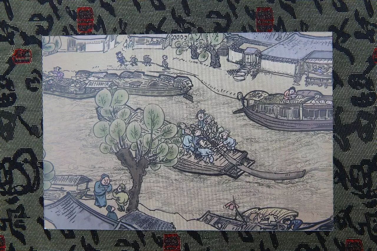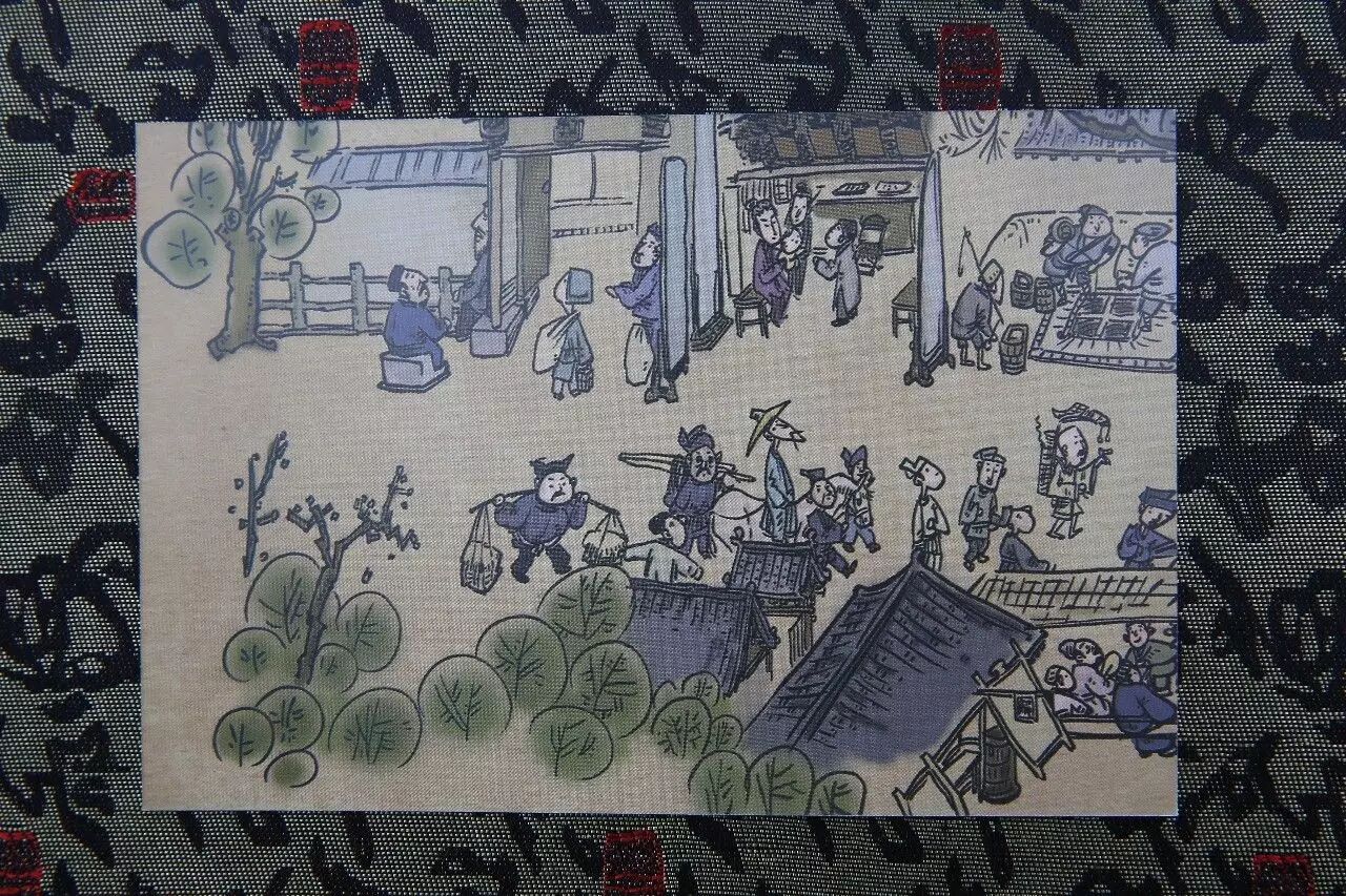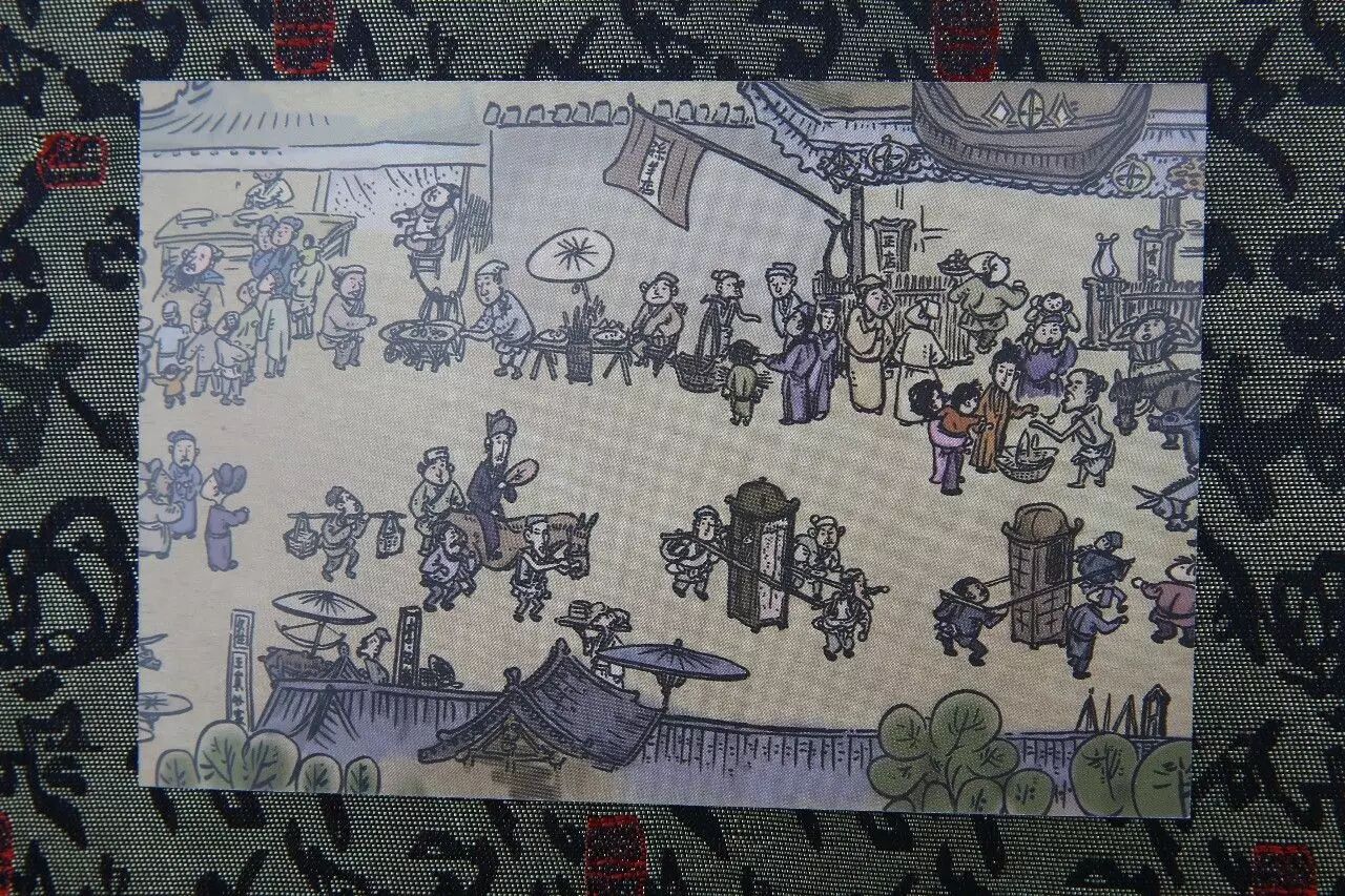 图中宋人的表情,神态,动作融入现代艺术形式,卖货郎、行脚僧、船夫等形态各异的人物形象跃然纸上,幽默风趣的表现了宋人的生活风貌。