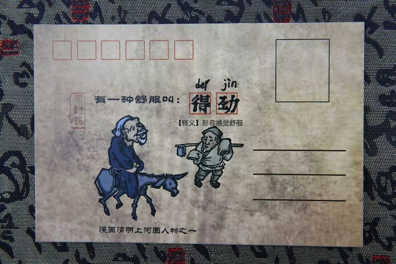 将《清明上河图》中一些具有代表性的人物漫像精挑出来,制作成明信片。更加有意思的是为每组人物配有"宋代普通话"一一开封话。诙谐幽默,妙趣横生。加之为每句开封话配有释义,让人感受到开封话的有趣,喜欢上开封文化!