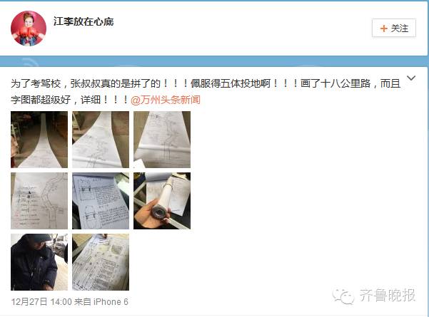 近日,微博网友“江李放在心底”爆料:重庆万州一50多岁男子为了考驾照,手绘了科目三在高粱18公里的路考详细攻略,长卷长近7米宽40厘米,标注了各种注意事项和图例。