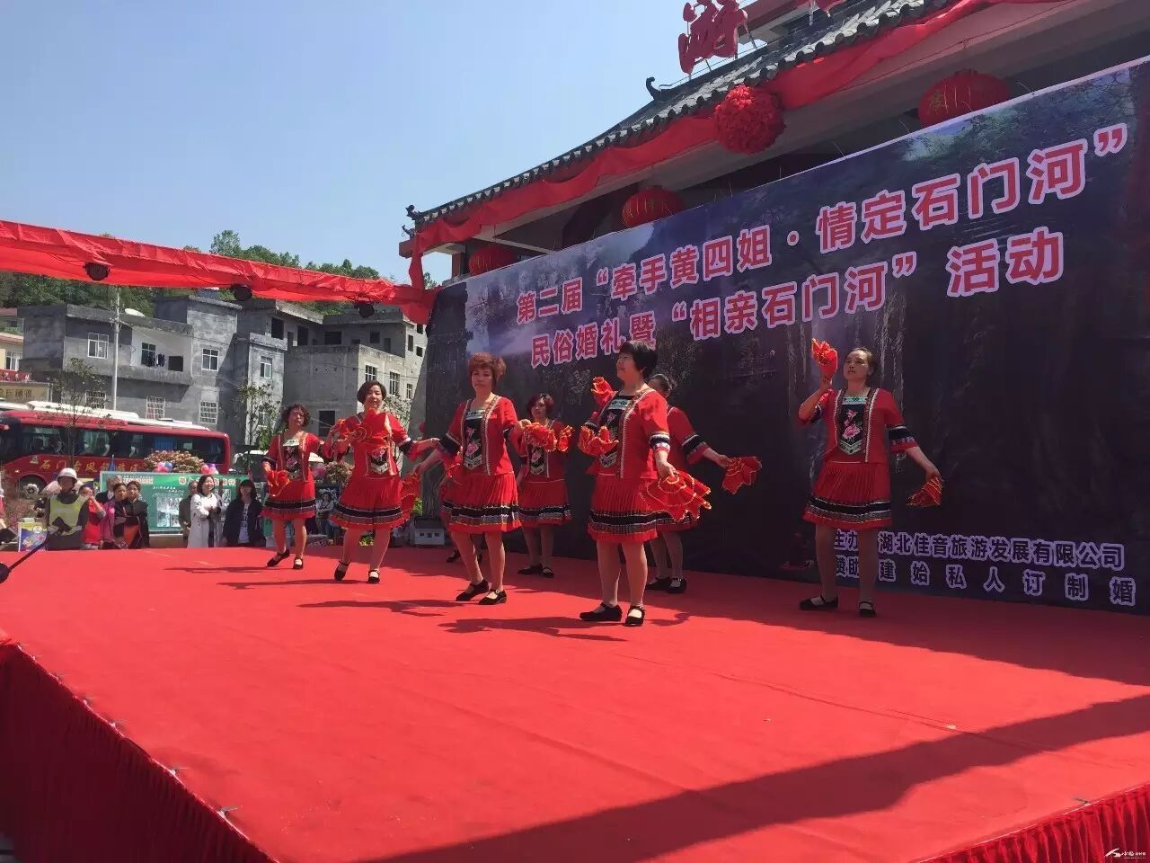 第二届 “牵手黄四姐·情定石门河” 民俗婚礼暨“相亲石门河”活动今天盛大开幕!一声声震撼人心的锣鼓声,或激情澎湃,或低沉婉转,伴随着中国传统乐器的敲打声,恍然回到古老年代。精彩绝伦的手帕舞,激情四射的现代舞,独具特色的腰鼓舞……无一不透露出现场的喜庆气氛。