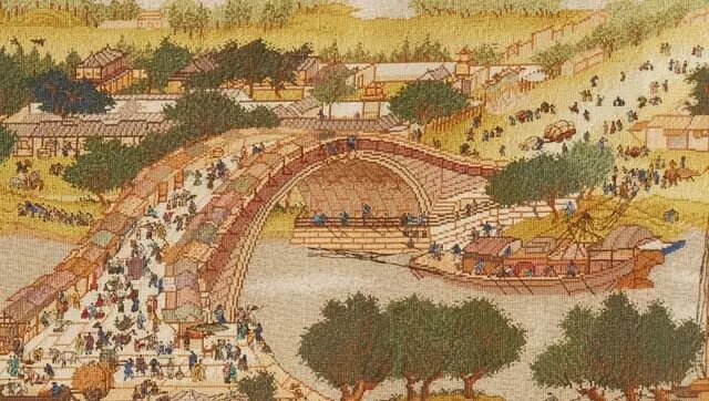各色人物、舟船车马、亭台楼阁、宫殿民房、山水树木惟妙惟肖,一针一线精细生动、平整光洁,连船夫手拉的纤绳、马夫手牵的马缰都绣得清清楚楚、生动传神……任谁也想不到,这样的绣品竟出自59岁的东北纯爷们手中!