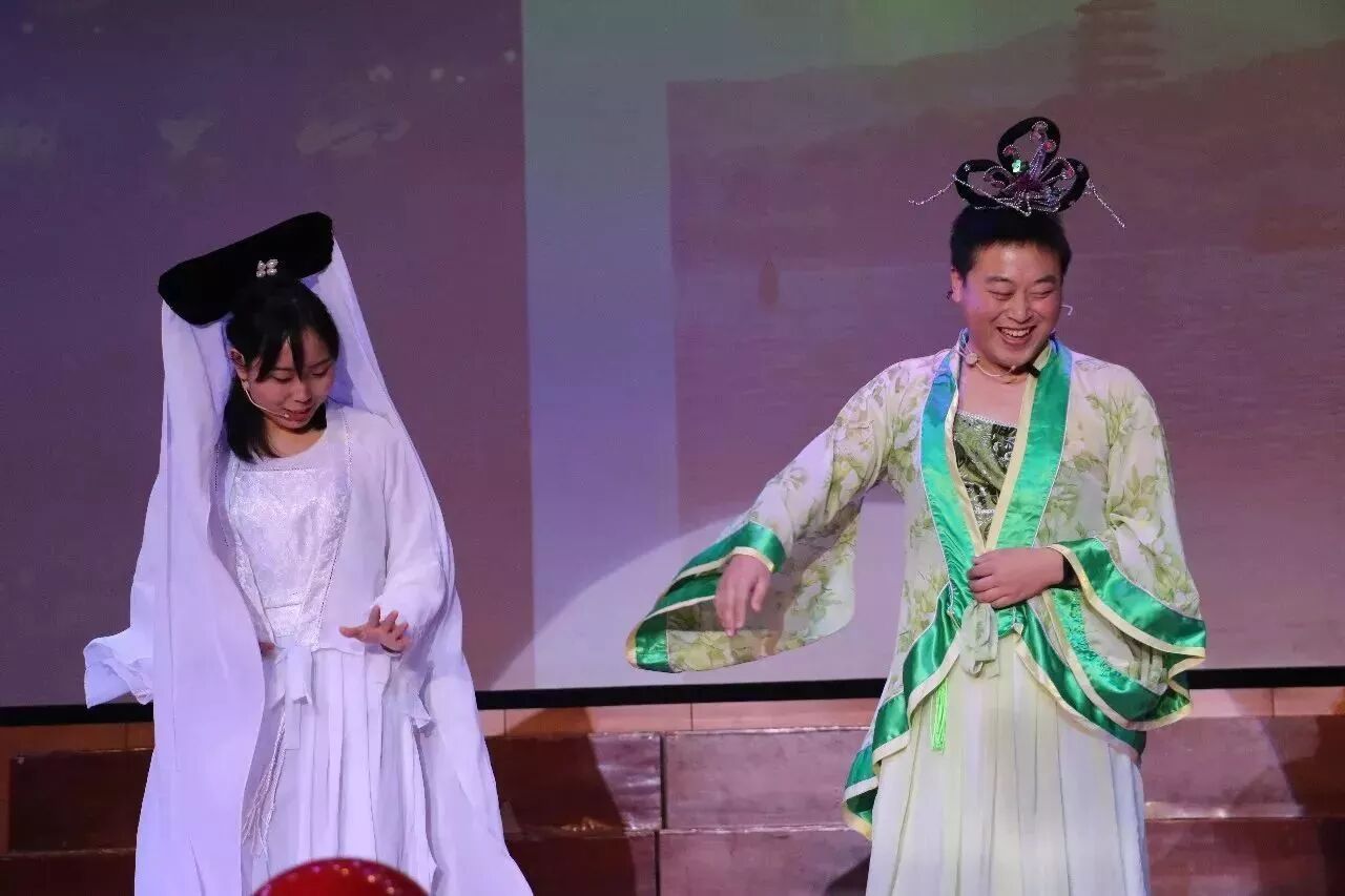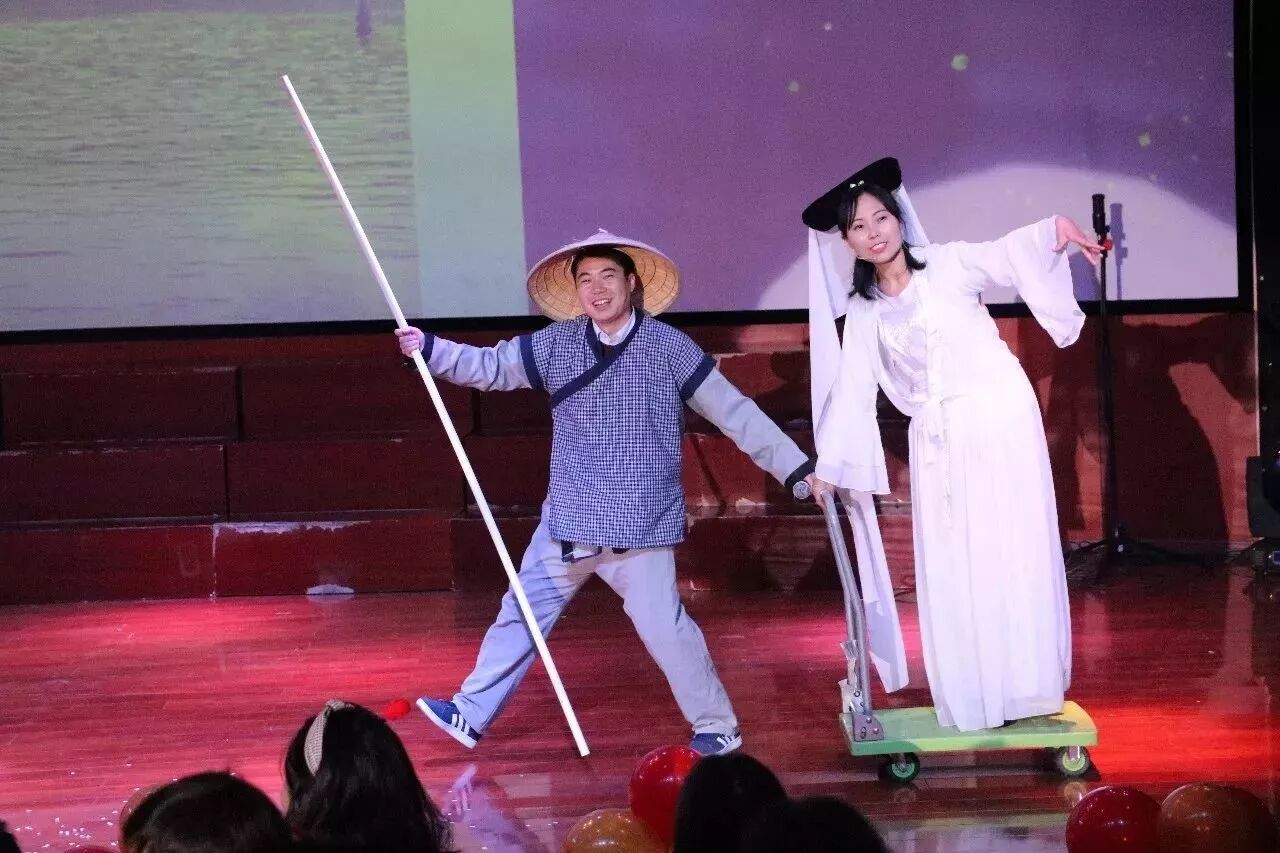 由初二年级老师别出心裁改编的情景剧《新白娘子传奇》,是今天的笑点担当。男老师反串的小青一出场,便“惊艳”全场,笑声此起彼伏。剧情更是曲折离奇,小青竟骑着电瓶车将法海堵在二环上,许仙居然是高度近视。整场演出频出金句,爆笑不断。