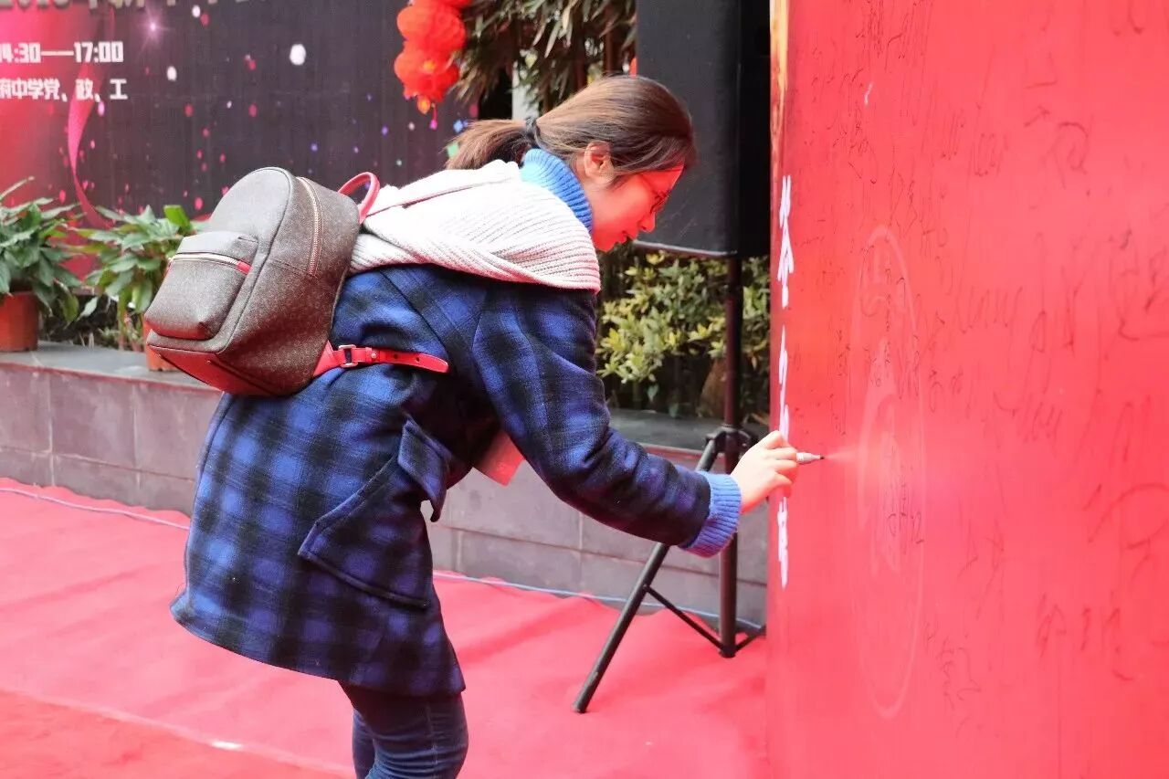 在电视里看过无数次明星走红毯,而今天红毯真真实实出现在老师们面前,无数的相机、摄影机全方位捕捉老师们最美的一面,再接受主持人的采访,送上新年祝福,并在签名墙上落下自己潇洒的身影。