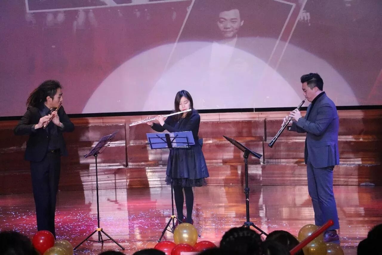 来自四川音乐学院交响乐团的成都国际古典音乐节演奏组合的著名长笛音乐家朱宇健老师,张佳宁老师,与石室中学的校友双簧管演奏家曾重老师,为大家带来了管乐三重奏《电影音乐组曲》。三重奏音色不一,时急时缓,让人耳目一新。