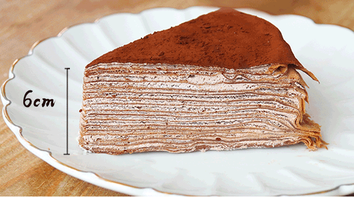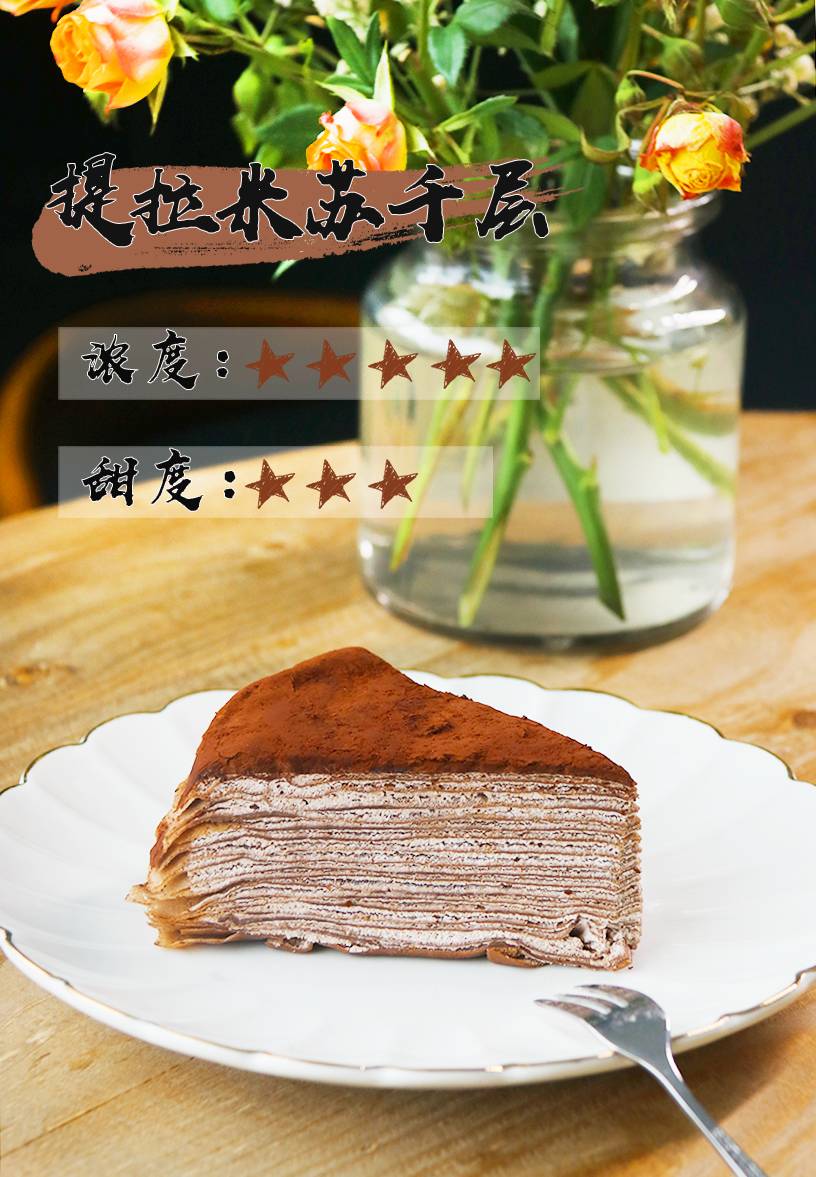 20层可丽饼堆得扎扎实实,足足6cm高!最爱的还是表皮的可可粉,独有的丝滑感,甜而不腻。一勺放进口中,就再也不愿撒手!