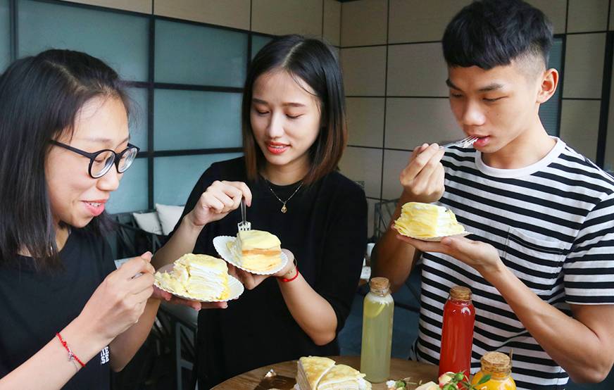 店里最抢手的就是榴莲千层蛋糕,单店一天平均有200人选择它,对榴莲控来说,这里就是天堂~