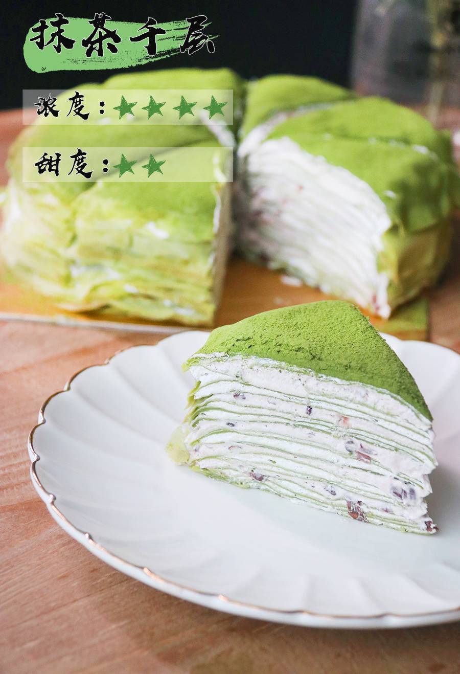 手工煎制的可丽饼每层抹上鲜奶油,云儿推荐选择加抹茶粉款的抹茶千层,口感更加醇厚丰富!不过抹茶比较容易氧化,建议尽快食用,口感更佳。