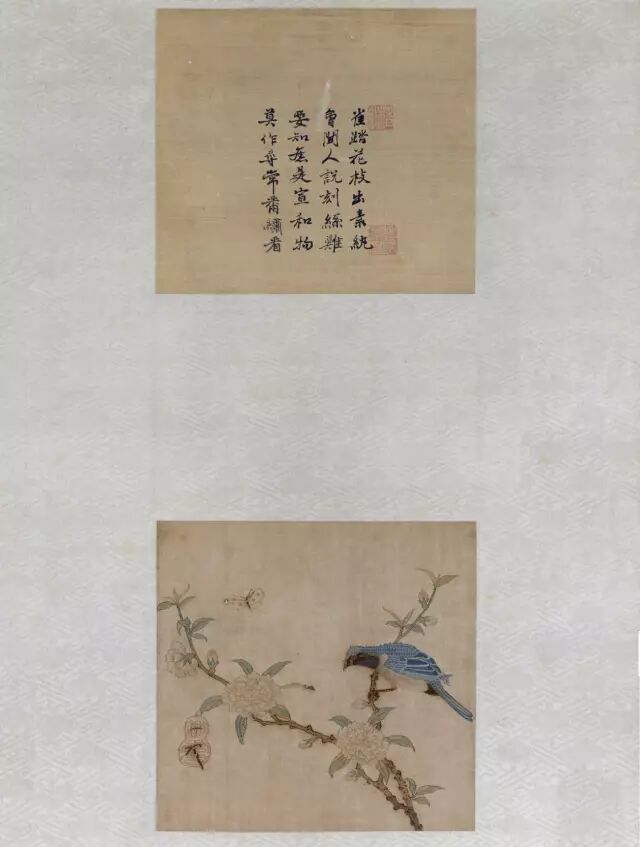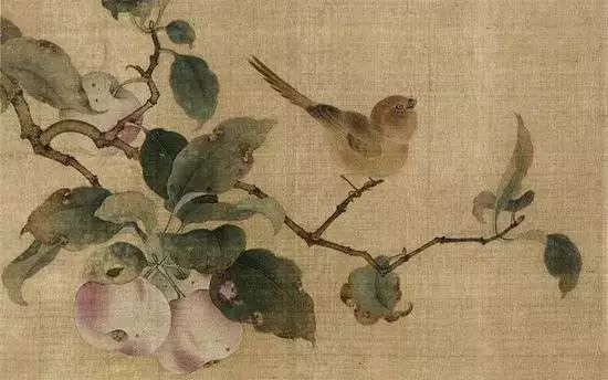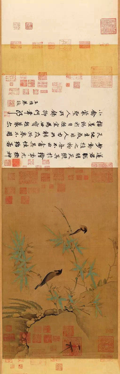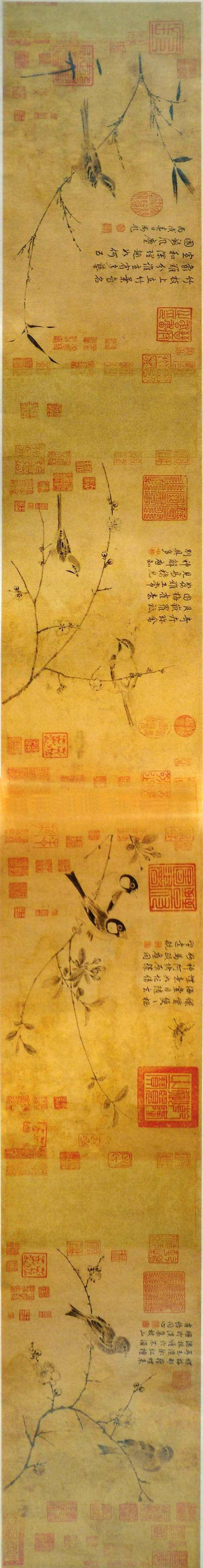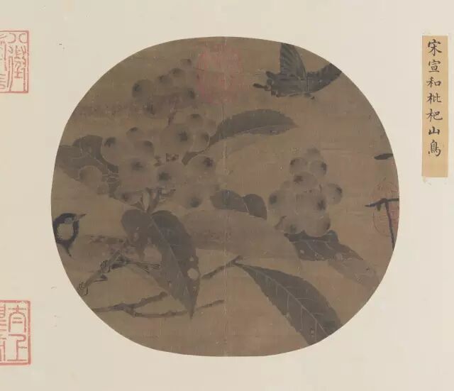 本幅款押“天下一人”。钤“御书”朱文葫芦形印一方。裱边题签:“宋宣和枇杷山鸟”。鉴藏印钤“宣统御览之宝”,中缝钤“八征耄念之宝”、“太上皇帝之宝”朱文印各一方。图中枇杷果实累累,枝叶繁盛。一山雀栖于枝上,翘首回望翩翩凤蝶,神情生动。此图体现崔白清澹之体。宋徽宗赵佶的花鸟画以设色为多,然而此图纯以水墨勾染而成,格调高雅,略似没骨画效果,别具一种苍劲细腻之韵致,体现了赵佶多方面的绘画才能。对开有清乾隆御题诗一首:“结实圆而椭,枇杷因以名。徒传象厥体,奚必问其声。鸟自讬形稳,蝶还翻影轻。宣和工位置,何事失东京。”感慨宋徽宗如此精于绘画,工于构图和经营位置,缘何却把国家丢失了?